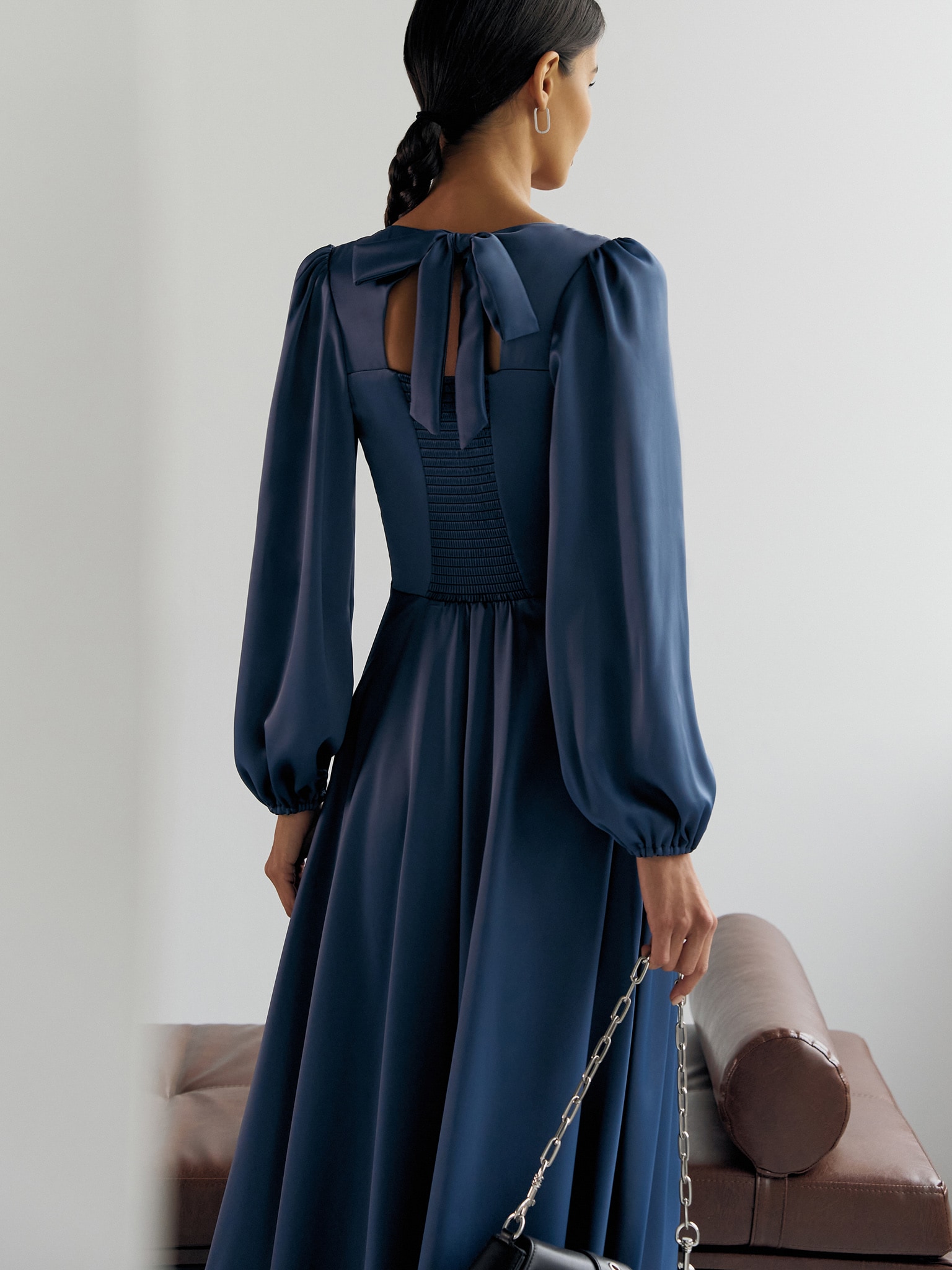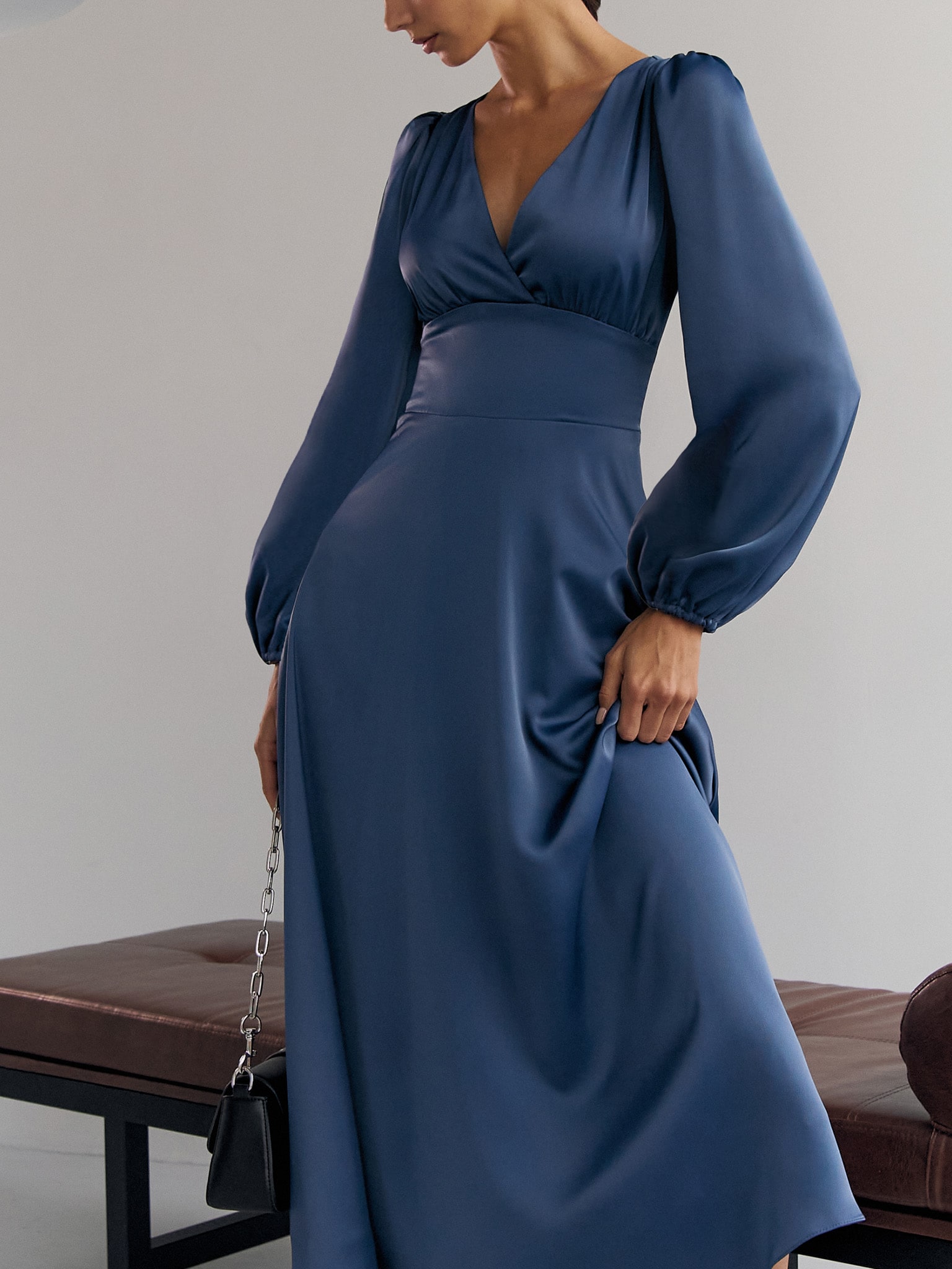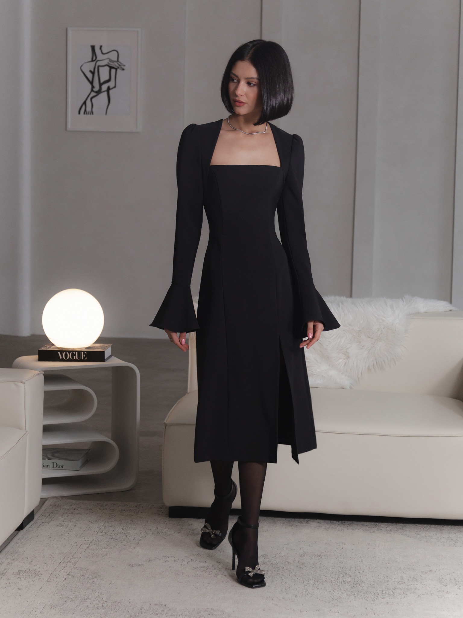 Платье миди с геометричным вырезом и объемными рукавами :: LICHI